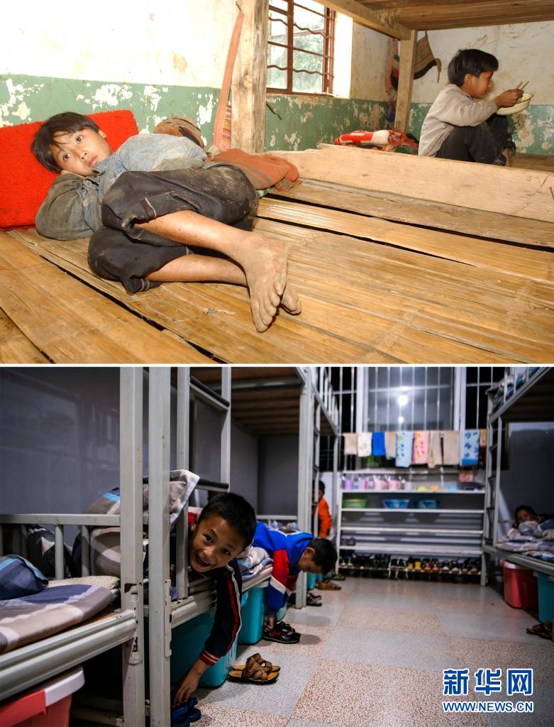 這張拼版照片的上圖:2003年6月13日,云南省瀾滄拉祜族自治縣木戛鄉(xiāng)哈卜嗎村小學的孩子在宿舍休息(新華社記者 秦晴 攝);下圖:2021年3月3日,云南省瀾滄拉祜族自治縣木戛鄉(xiāng)哈卜嗎村小學的孩子們準備睡覺(新華社記者 江文耀 攝)。新華社發(fā)