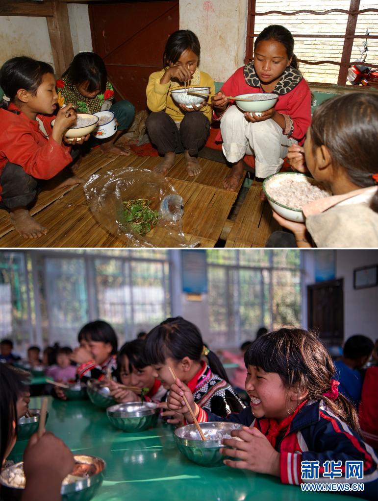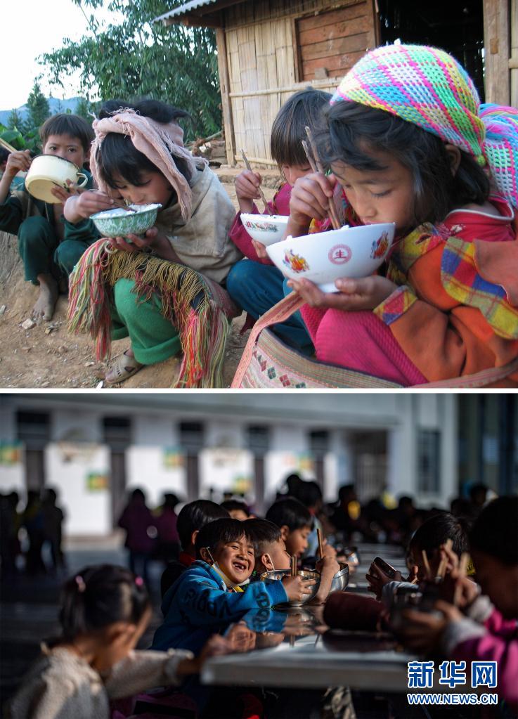 這張拼版照片的上圖:2003年12月6日,云南省瀾滄拉祜族自治縣富邦鄉(xiāng)半山村小學的孩子們在吃飯(新華社記者 李銀 攝);下圖:2021年3月2日,云南省瀾滄拉祜族自治縣富邦鄉(xiāng)半山村小學已撤并到富邦鄉(xiāng)中心完小,這是孩子們在吃飯(新華社記者 江文耀 攝)。新華社發(fā)