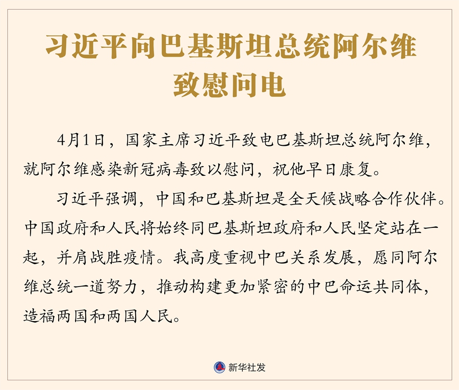 新華社北京4月2日電 4月1日,國家主席習(xí)近平致電巴基斯坦總統(tǒng)阿爾維,就阿爾維感染新冠病毒致以慰問,祝他早日康復(fù)。