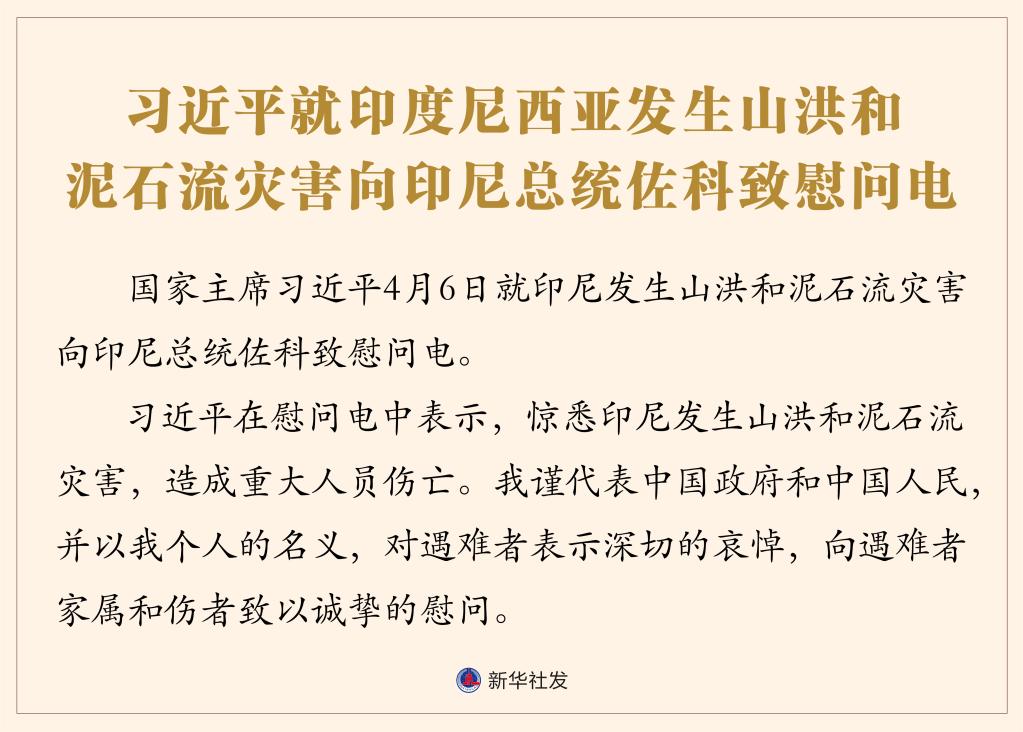 新華社北京4月6日電 國家主席習近平4月6日就印尼發(fā)生山洪和泥石流災害向印尼總統(tǒng)佐科致慰問電。