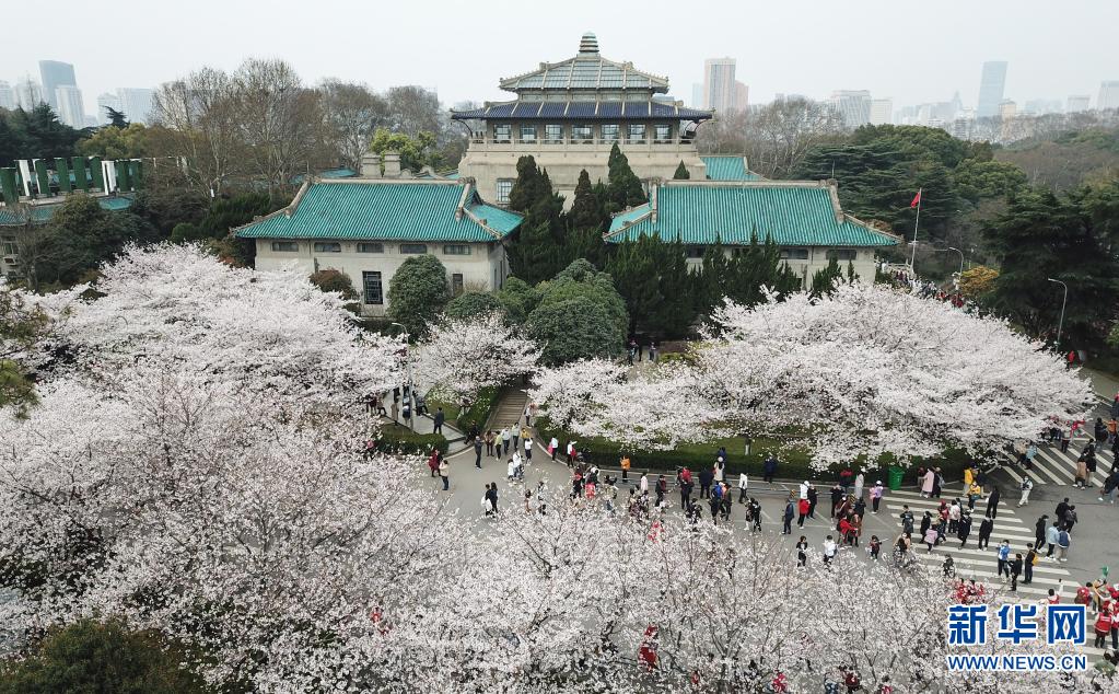 3月13日,武漢大學(xué)抗疫醫(yī)護(hù)人員賞櫻專場啟動(dòng),來自全國各地的援鄂抗疫英雄在櫻花樹下重逢,盡享櫻花之約(無人機(jī)照片)。新華社記者 程敏 攝