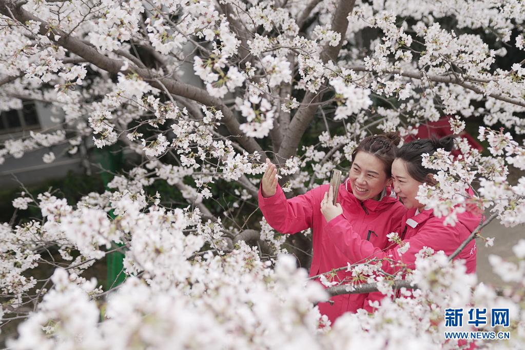 3月13日,武漢雷神山醫(yī)院醫(yī)護(hù)人員在櫻花樹下賞花。當(dāng)日,武漢大學(xué)抗疫醫(yī)護(hù)人員賞櫻專場啟動(dòng),來自全國各地的援鄂抗疫英雄在櫻花樹下重逢,盡享櫻花之約。新華社記者 熊琦 攝