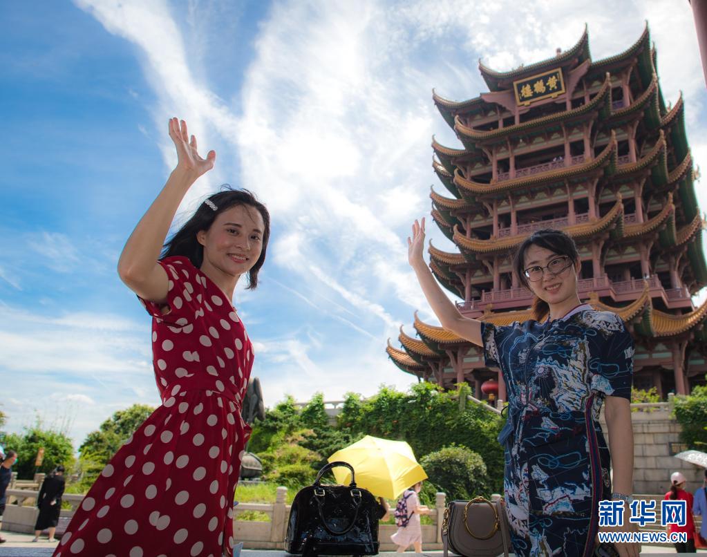 2020年8月7日,受邀來湖北旅游的海南援鄂醫(yī)療隊(duì)員陳小妹(左)與同事計(jì)超在黃鶴樓景區(qū)觀光。湖北省組織“與愛同行 惠游湖北”活動(dòng),陸續(xù)邀請?jiān)踽t(yī)護(hù)人員代表以及湖北醫(yī)護(hù)人員、社區(qū)工作者、志愿者等走進(jìn)景區(qū),飽覽荊楚風(fēng)貌。新華社記者 肖藝九 攝