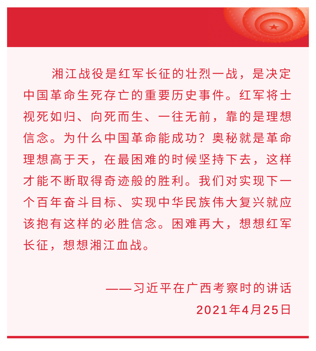 1934年11月下旬至12月上旬,為確保中共中央和中央紅軍主力渡過湘江,粉碎敵人圍殲紅軍于湘江以東的企圖,數萬紅軍將士浴血奮戰(zhàn),譜寫了一曲壯麗的革命史詩。