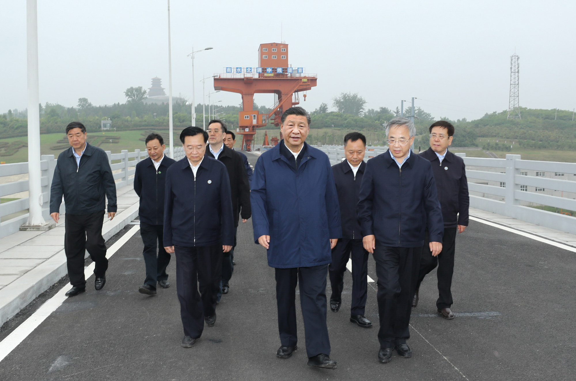 ↑這是13日下午,習(xí)近平在南陽(yáng)市淅川縣陶岔渠首樞紐工程察看引水閘運(yùn)行情況。