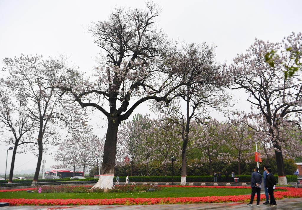 在河南省蘭考縣焦裕祿干部學(xué)院門口,人們在“焦桐”下參觀(2021年4月20日攝)。新華社記者郝源攝