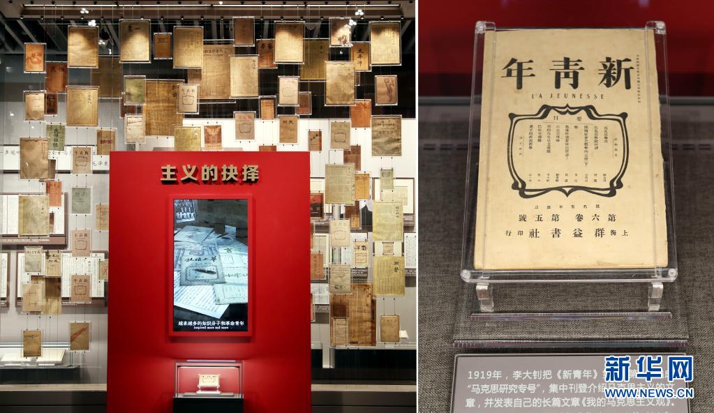 大型立體式視覺置景名為“主義的抉擇”,100件五四運(yùn)動前后傳播馬克思主義、社會主義的報(bào)紙雜志,錯(cuò)落陳列在玻璃墻上。其中,《新青年》第6卷第5號“馬克思研究專號”在前端“高光”展示,這期“專號”標(biāo)志著馬克思主義在中國的傳播進(jìn)入了較為系統(tǒng)的階段(6月1日攝)。新華社記者 劉穎 攝