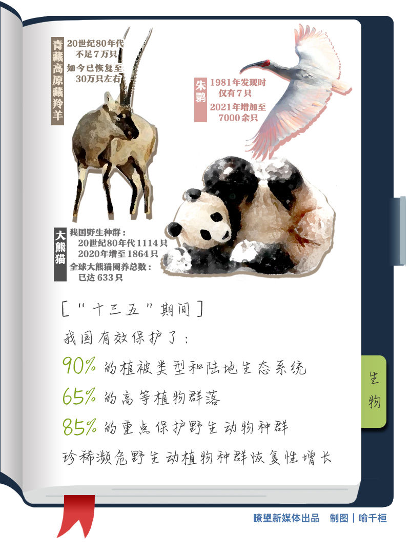 瀕危野生動植物保護(hù)不斷強(qiáng)化。“十三五”期間,我國有效保護(hù)了90%的植被類型和陸地生態(tài)系統(tǒng)、65%的高等植物群落,85%的重點(diǎn)保護(hù)野生動物種群,大熊貓、朱鹮、藏羚羊、蘇鐵等珍稀瀕危野生動植物種群實(shí)現(xiàn)恢復(fù)性增長。