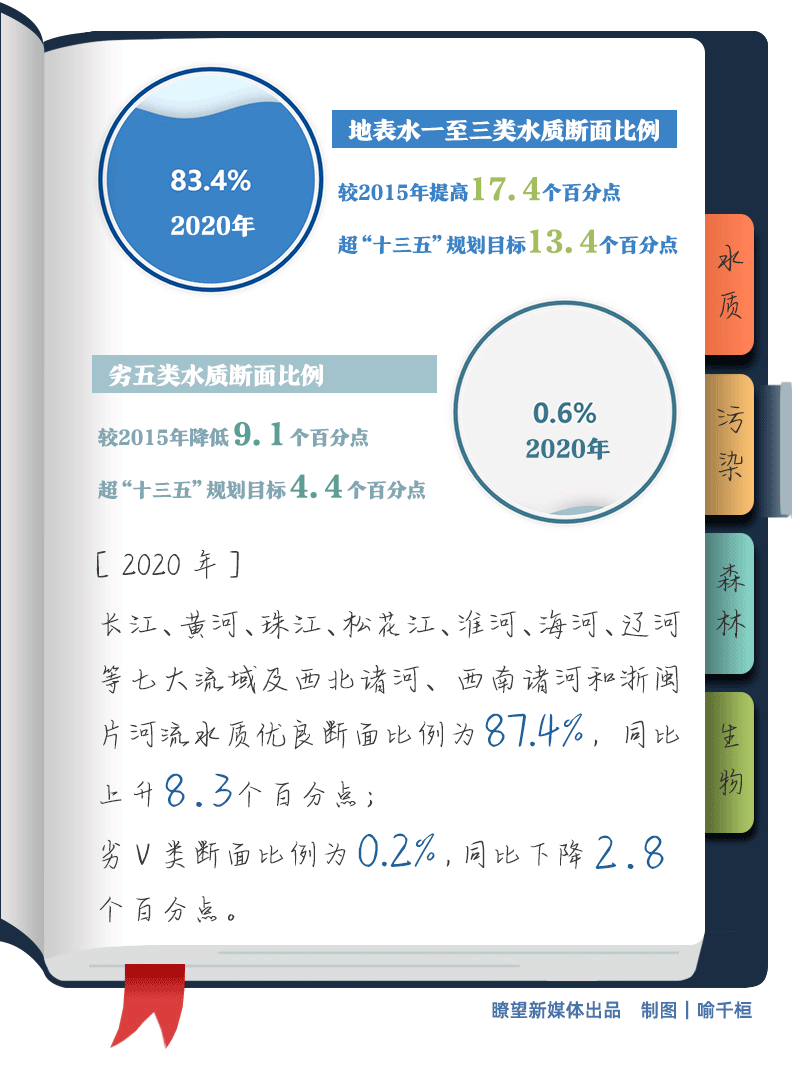 碧水更多,水質(zhì)更優(yōu)良。地表水Ⅰ至Ⅲ類水質(zhì)斷面比例由66%上升至83.4%,提高17.4個百分點(diǎn),超過“十三五”規(guī)劃目標(biāo)13.4個百分點(diǎn);劣Ⅴ類水質(zhì)斷面比例由9.7%下降到0.6%,降低9.1個百分點(diǎn),超過“十三五”規(guī)劃目標(biāo)4.4個百分點(diǎn)。