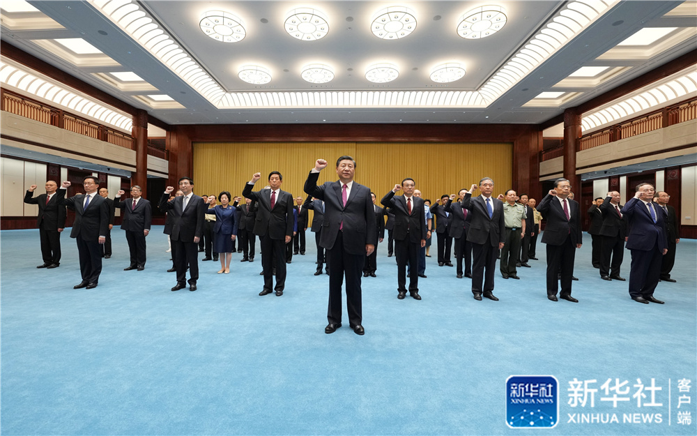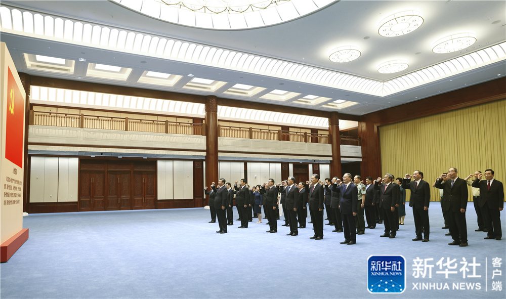 6月18日,黨和國家領(lǐng)導(dǎo)人習(xí)近平、李克強、栗戰(zhàn)書、汪洋、王滬寧、趙樂際、韓正、王岐山等在中國共產(chǎn)黨歷史展覽館參觀“‘不忘初心、牢記使命’中國共產(chǎn)黨歷史展覽”。這是參觀結(jié)束后,習(xí)近平帶領(lǐng)黨員領(lǐng)導(dǎo)同志一起重溫入黨誓詞。新華社記者 鞠鵬 攝