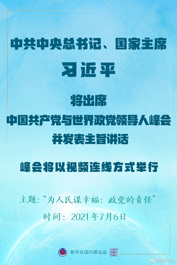 中共中央對(duì)外聯(lián)絡(luò)部發(fā)言人胡兆明5日宣布,中國(guó)共產(chǎn)黨與世界政黨領(lǐng)導(dǎo)人峰會(huì)將于7月6日以視頻連線方式舉行,中共中央總書(shū)記、國(guó)家主席習(xí)近平將在北京出席會(huì)議并發(fā)表主旨講話。此次會(huì)議的主題為“為人民謀幸福:政黨的責(zé)任”,160多個(gè)國(guó)家的500多位政黨和政治組織等領(lǐng)導(dǎo)人以及逾萬(wàn)名政黨代表等將出席會(huì)議。