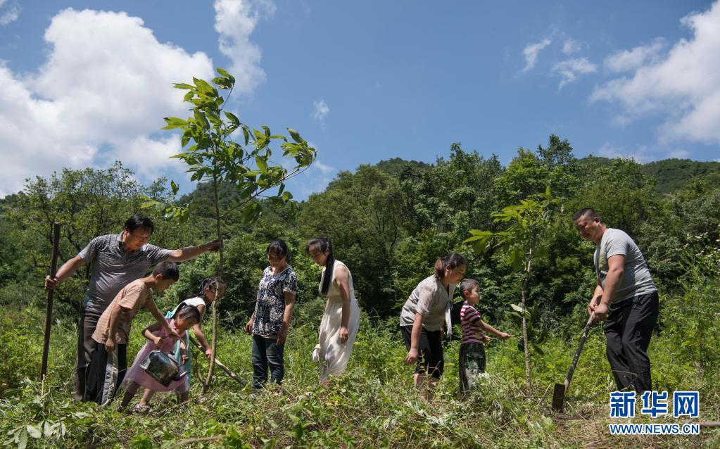 姚祖元(右一)與家人一起種樹(2019年7月13日攝)。在秦嶺深處的陜西省漢中市留壩縣火燒店鎮(zhèn),姚家五代人歷時70年深耕秦嶺的故事在當?shù)丶矣鲬魰裕瑐鳛榧言?。新華社記者 陶明 攝
