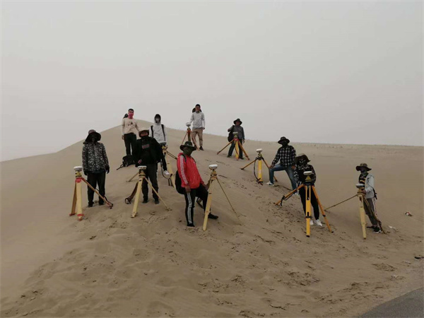 后來,唐飛帶領(lǐng)團(tuán)隊又前往新疆若羌,為中鐵一局三公司和若鐵路項(xiàng)目進(jìn)行前期控制網(wǎng)復(fù)測。項(xiàng)目線路長、地廣人稀,且地處塔克拉瑪干沙漠邊緣。為了節(jié)省時間,每天早上他和隊員背著馕、咸菜、礦泉水出發(fā),在沙漠戈壁一測就是十二個小時,晚上八九點(diǎn)左右才能回去吃口熱飯。有一次,他們在工地上測量時,突遇沙塵暴,他和三個組員趕快收拾儀器,裝進(jìn)儀器箱,四個人圍在一起,等著沙塵暴過去。