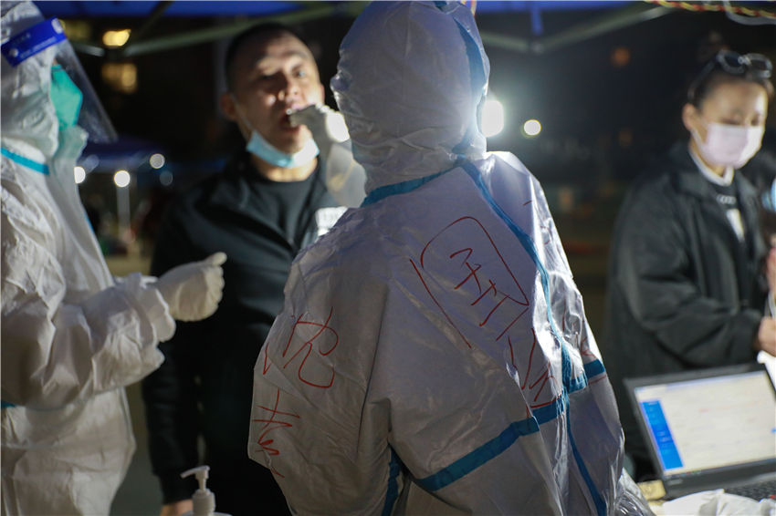 西安國(guó)際醫(yī)學(xué)中心醫(yī)護(hù)人員進(jìn)行核酸采樣工作。