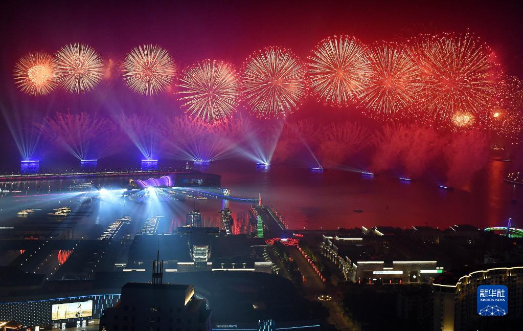 這是在青島舉行的《有朋自遠(yuǎn)方來(lái)》燈光焰火藝術(shù)表演(2018年6月9日晚攝)。2018年6月9日至10日,上海合作組織成員國(guó)元首理事會(huì)第十八次會(huì)議在青島召開。新華社記者 李紫恒 攝