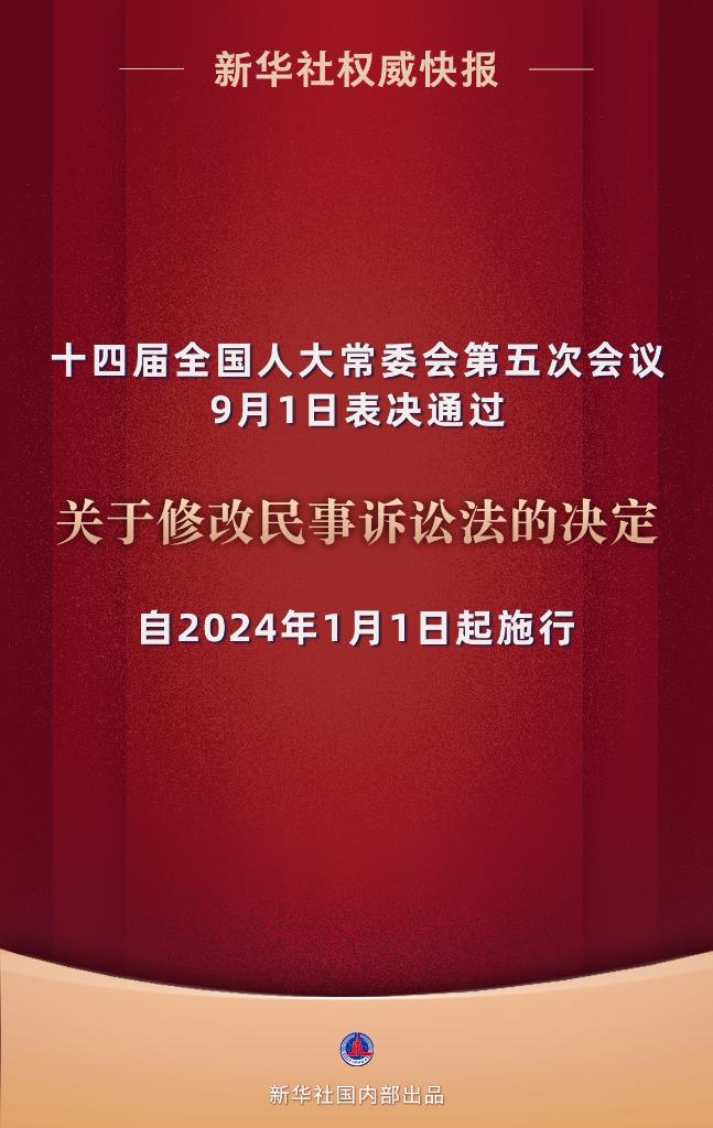 9月1日,十四屆全國(guó)人大常委會(huì)第五次會(huì)議表決通過關(guān)于修改民事訴訟法的決定,自2024年1月1日起施行。