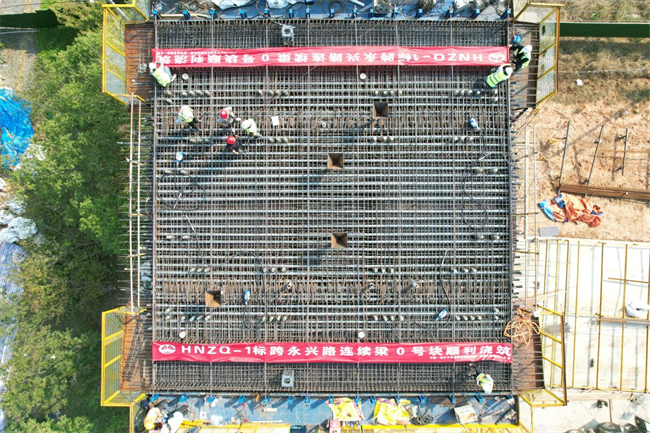 跨京滬高鐵立交特大橋位于滁河西岸,安徽省滁州市南譙區(qū)烏衣鎮(zhèn)和全椒縣十字鎮(zhèn)境內,總長17.5公里。其中跨永興路連續(xù)梁為三跨變截面箱梁,跨越滁州市南讓區(qū)永興路,橋跨位置對應跨京滬高鐵立交特大橋180#墩至183#墩,全長177.7米,0#塊長度達12米。由于0#段內預應力筋布置復雜、非預應力筋密集,要求一次澆筑成型,施工難度大。為保證施工質量,此次澆筑總體以“統(tǒng)籌規(guī)劃、科學組織、重點先行、分段展開、均衡生產(chǎn)、標準化作業(yè)、有序推進”為原則展開施工。