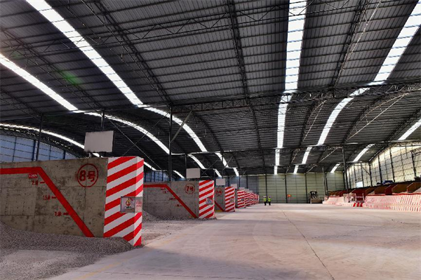 8標(biāo)拌和站建設(shè)在受到地形限制的情況下,沒有機(jī)械執(zhí)行“標(biāo)準(zhǔn)化”要求,創(chuàng)新地提出了新方案。按照標(biāo)準(zhǔn),拌和站料倉(cāng)是一排設(shè)立,而8標(biāo)2號(hào)拌和站是在一半劈山、一半填方的基礎(chǔ)上建設(shè)的,地形不允許一排設(shè)立料倉(cāng)。項(xiàng)目部就改為兩邊對(duì)稱設(shè)立。進(jìn)而,又激發(fā)了項(xiàng)目部在原料樣品盒設(shè)置上的創(chuàng)新思維。料倉(cāng)樣品盒,慣例都是在料倉(cāng)隔離墻一側(cè)的一個(gè)架子上放著,在8標(biāo)2號(hào)拌和站,要是這樣放置的話,受距離和面積限制很容易被鏟車掛掉。項(xiàng)目部總工張廣輝提出,在隔離墻一側(cè)高1.2米的位置鑲?cè)胍粋€(gè)50厘米見方的盒子作為樣品盒。建成后,既沒有侵占距離和空間,又使得隔離墻整齊美觀,而且還不用更換盒子經(jīng)濟(jì)實(shí)惠。