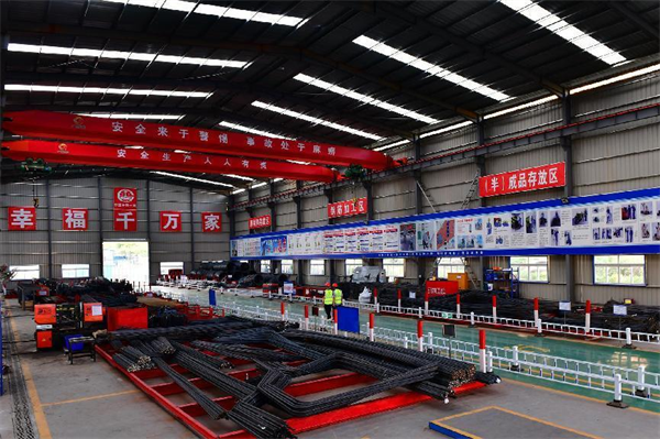 作為臨建標(biāo)準(zhǔn)化建設(shè)的重要標(biāo)志,桂鐘5、8標(biāo)段的鋼筋加工廠,廠房高度12米,作業(yè)場(chǎng)地平整、硬化。加工場(chǎng)內(nèi)醒目位置都設(shè)置工程公示牌、施工平面布置圖、安全生產(chǎn)牌、消防保衛(wèi)牌、管理人員名單及監(jiān)督電話牌、文明施工牌等明示標(biāo)志。加工廠內(nèi)按照功能設(shè)立了原材料堆放區(qū)、鋼筋下料區(qū)、加工制作區(qū)、鋼筋籠預(yù)拼接區(qū)、半成品堆放區(qū);還設(shè)置安裝了龍門數(shù)控切割機(jī)、全自動(dòng)數(shù)控液壓鋼筋調(diào)直切斷機(jī)、鋼筋快速鋸床、數(shù)控鋼筋彎曲機(jī)、數(shù)控鋼筋調(diào)直機(jī)、數(shù)控鋼筋彎箍機(jī)、數(shù)字化工業(yè)焊接機(jī)器人、數(shù)控滾籠焊機(jī)、數(shù)控立式彎曲中心、全自動(dòng)數(shù)控彎箍機(jī)、鋸切套絲打磨生產(chǎn)線等等機(jī)械化、數(shù)字化設(shè)備并懸掛著機(jī)械操作安全規(guī)定公示牌和設(shè)備標(biāo)示牌。這些工裝工藝標(biāo)準(zhǔn)化為項(xiàng)目部標(biāo)準(zhǔn)化建設(shè)賦能。