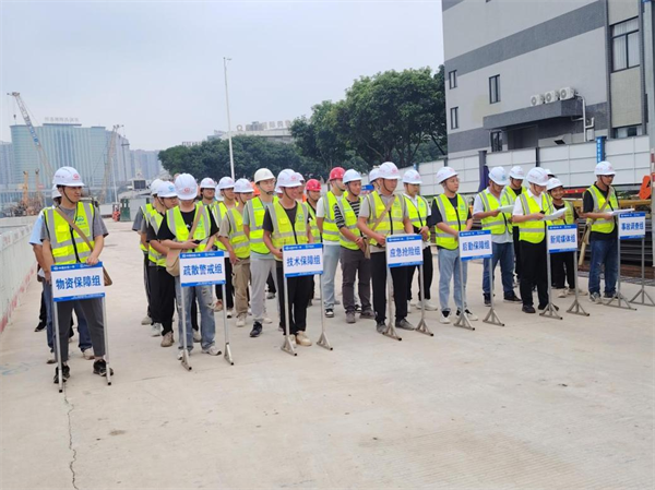 演練模擬項目車站在深基坑土方開挖過程中出現(xiàn)涌水涌泥緊急情況,接到“險情”匯報后,項目負責人歐瓊第一時間迅速啟動應急預案,立即組織疏散警戒組人員到達現(xiàn)場緊急疏散人群,做好警戒,確保搶險道路暢通。應急演練從發(fā)現(xiàn)險情、啟動應急預案、應急搶險到恢復正常生產(chǎn)秩序,時長近60分鐘,啟用各類車輛、機械10多輛(臺)。演練人員聞警而動,各個環(huán)節(jié)緊密銜接,各職能部門密切配合,處置得當,搶險反應迅速,在短時間內(nèi)完成了搶險救援工作,整個演練過程緊張有序,取得了良好的效果。
