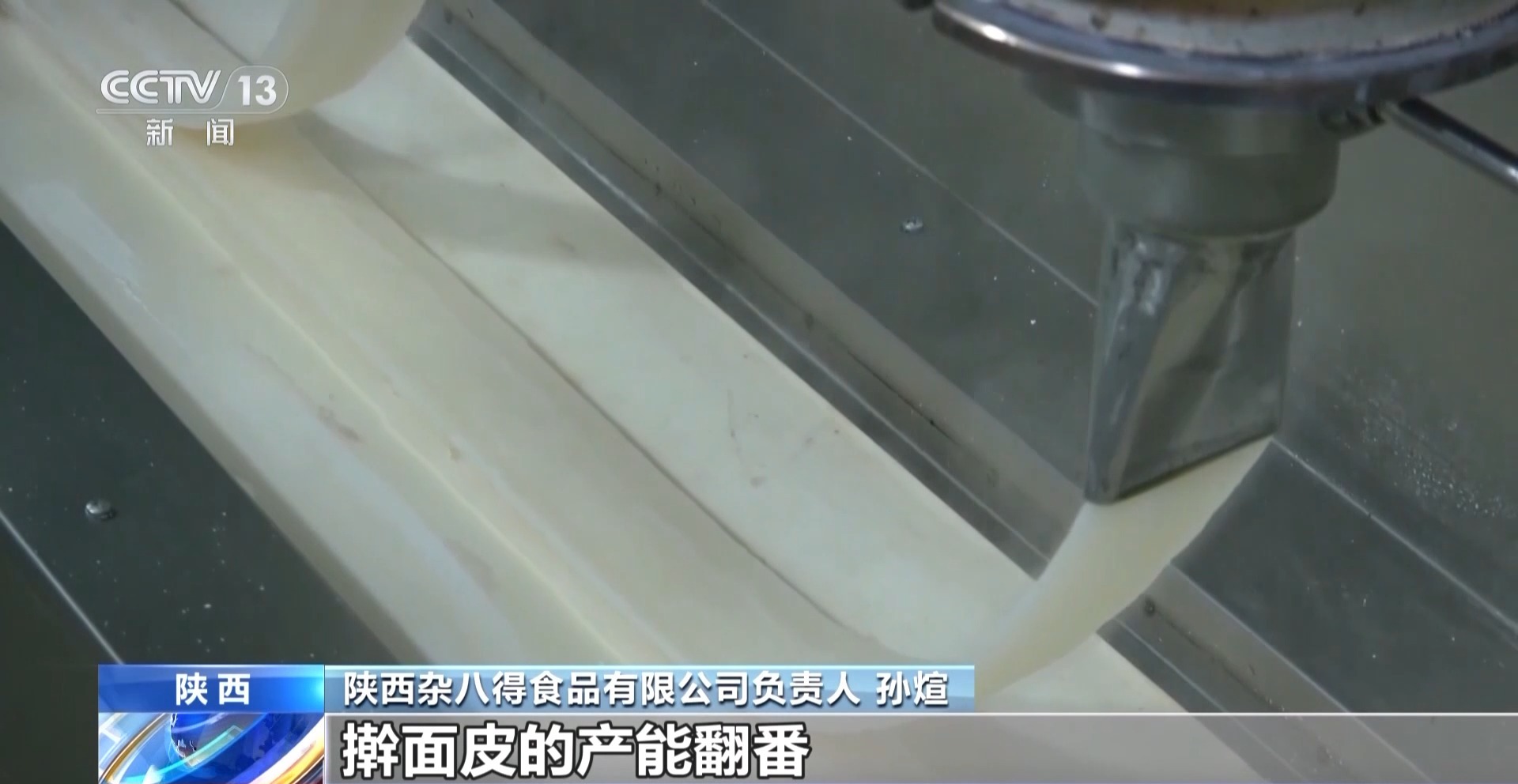 陜西雜八得食品有限公司負(fù)責(zé)人 孫煊:靠手工滿足不了現(xiàn)在的消費(fèi)需要,最主要是產(chǎn)能保障不了。現(xiàn)在搟面皮由生變熟依靠這個(gè)專利技術(shù)來(lái)實(shí)現(xiàn),搟面皮的產(chǎn)能翻番,每分鐘一臺(tái)單機(jī)達(dá)到60公斤的產(chǎn)能。