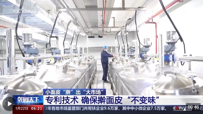 陜西雜八得食品有限公司生產(chǎn)總監(jiān) 孫燕博:創(chuàng)新點(diǎn)是可以控制發(fā)酵時(shí)間、發(fā)酵溫度。我們要求8個(gè)小時(shí)發(fā)酵好,這是通過設(shè)備工藝測(cè)算出來(lái)的最佳發(fā)酵時(shí)間。通過我們這個(gè)發(fā)酵的專利技術(shù),保證了搟面皮的口味正宗地道,保證大家能吃到兒時(shí)的味道,家鄉(xiāng)的味道。
