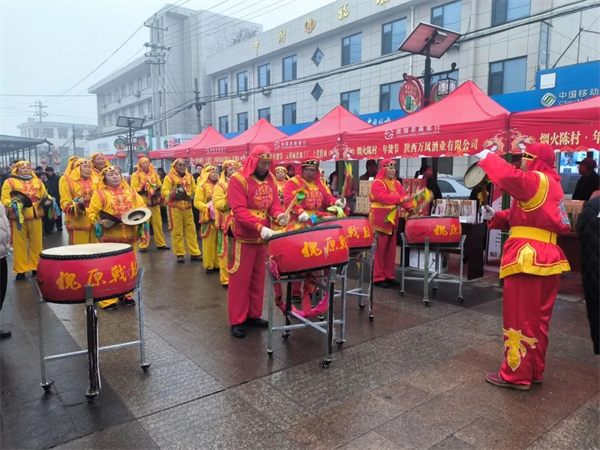 上午九時,活動現(xiàn)場人聲鼎沸,熱鬧非凡。省級非物質(zhì)文化遺產(chǎn)項目“槐原戰(zhàn)鼓”氣勢恢宏,擂響了煙火陳村促經(jīng)濟,家鄉(xiāng)年貨帶消費的新征程。