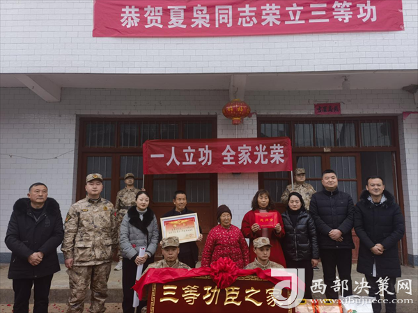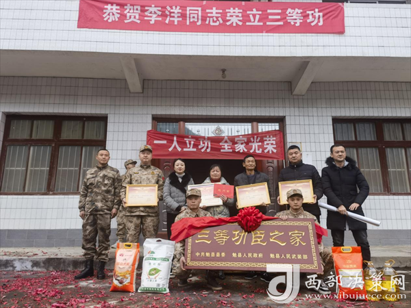 西部決策網(wǎng)訊 喜報送到家,榮譽(yù)獻(xiàn)功臣。春節(jié)前夕,現(xiàn)役軍人李洋、夏梟和他的家人收到了一份特殊的“禮物”。勉縣退役軍人事務(wù)局、阜川鎮(zhèn)主要領(lǐng)導(dǎo)、鎮(zhèn)人武部和鎮(zhèn)退役軍人服務(wù)站及村“兩委”有關(guān)負(fù)責(zé)人,專程將立功喜報、三等功臣之家牌匾送到李洋、夏梟的家中,為他送上榮譽(yù)和祝福。