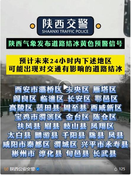預(yù)計未來24小時內(nèi)下述地區(qū)可能出現(xiàn)對交通有影響的道路結(jié)冰:西安市灞橋區(qū)、未央?yún)^(qū)、雁塔區(qū)、閻良區(qū)、臨潼區(qū)、長安區(qū)、鄠邑區(qū)、高陵區(qū)、藍田縣、周至縣、西咸新區(qū),寶雞市渭濱區(qū)、金臺區(qū)、陳倉區(qū)、扶風(fēng)縣、眉縣、岐山縣、鳳翔區(qū)、太白縣、麟游縣、千陽縣、隴縣、鳳縣,咸陽市秦都區(qū)、渭城區(qū)、興平市、武功縣、三原縣、涇陽縣、禮泉縣、乾縣、永壽縣、彬州市、淳化縣、旬邑縣、長武縣,銅川市王益區(qū)、印臺區(qū)、耀州區(qū)、宜君縣,渭南市臨渭區(qū)、華陰市、華州區(qū)、潼關(guān)縣、大荔縣、澄城縣、合陽縣、蒲城縣、富平縣、白水縣,延安市寶塔區(qū)、安塞區(qū)、黃陵縣、黃龍縣、宜川縣、洛川縣、富縣、甘泉縣、吳起縣、志丹縣、子長市、延川縣、延長縣,榆林市榆陽區(qū)、橫山區(qū)、神木市、府谷縣、定邊縣、靖邊縣、綏德縣、米脂縣、佳縣、吳堡縣、清澗縣、子洲縣,漢中市南鄭區(qū)、城固縣、洋縣、勉縣、西鄉(xiāng)縣、略陽縣、鎮(zhèn)巴縣、寧強縣、留壩縣、佛坪縣,安康市漢濱區(qū)、漢陰縣、石泉縣、寧陜縣、紫陽縣、嵐皋縣、平利縣、鎮(zhèn)坪縣、旬陽市、白河縣,商洛市商州區(qū)、洛南縣、山陽縣、鎮(zhèn)安縣、丹鳳縣、商南縣、柞水縣,楊凌示范區(qū)楊陵區(qū),韓城市,請注意防范。