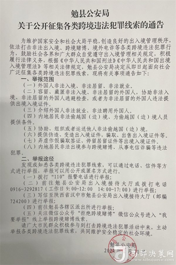 西部決策網(wǎng)訊 為維護(hù)國家安全和社會(huì)大局平穩(wěn),創(chuàng)造良好的出入境管理秩序,依法打擊非法出入境、跨境賭博、境外電詐等各類跨境違法犯罪行為,鼓勵(lì)社會(huì)各界和廣大群眾自覺遵守出入境管理相關(guān)規(guī)定,積極履行法律義務(wù),根據(jù)《中華人民共和國刑法》《中華人民共和國出境入境管理法》等相關(guān)法律規(guī)定,勉縣公安局決定從即日起面向社會(huì)廣泛征集各類跨境違法犯罪線索,現(xiàn)將有關(guān)事項(xiàng)通告如下: