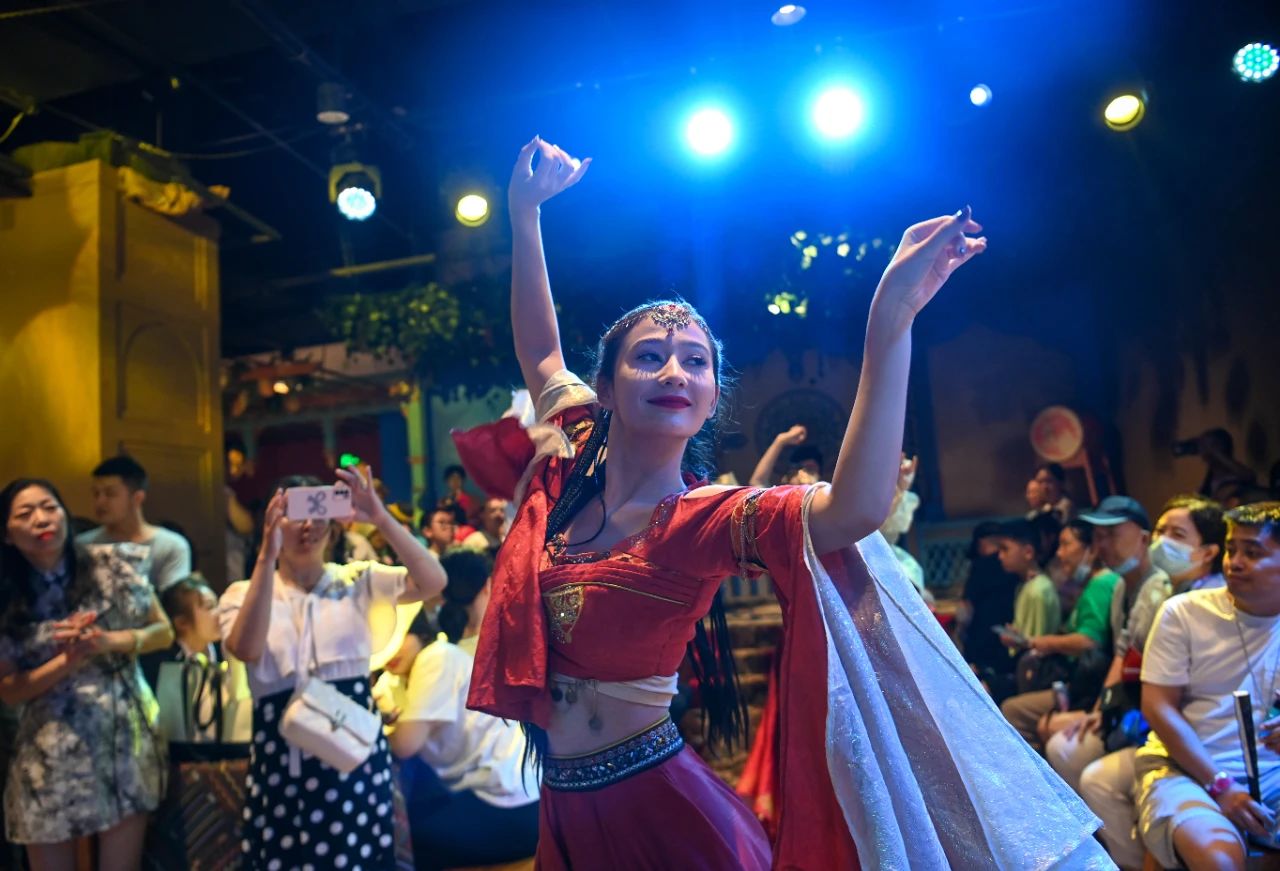 游客在長(zhǎng)安十二時(shí)辰主題街區(qū)觀看唐風(fēng)演藝《胡姬酒肆》鄒競(jìng)一 攝