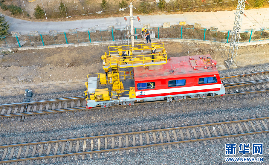 春運(yùn)期間,在隴海鐵路虢鎮(zhèn)至陽平區(qū)段,劉建強(qiáng)和他的工友們在供電接觸網(wǎng)軌道作業(yè)車上進(jìn)行檢修作業(yè)。劉一江 航拍
