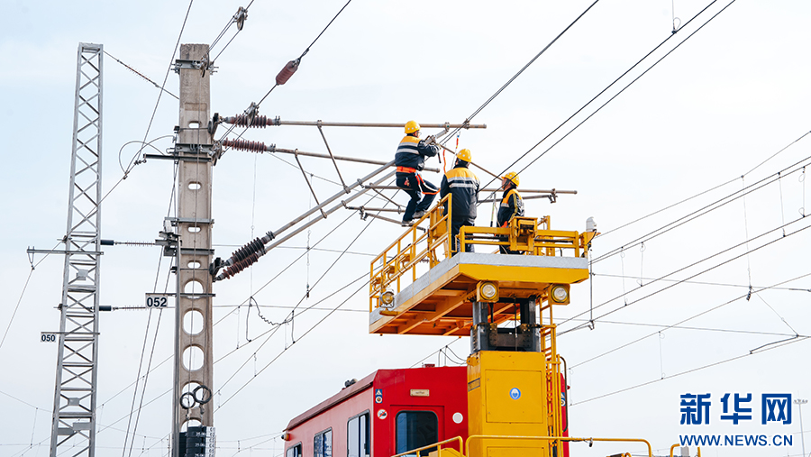 在隴海鐵路虢鎮(zhèn)至陽平區(qū)段,劉建強(qiáng)和他的工友在供電接觸網(wǎng)軌道作業(yè)車上緊固接觸網(wǎng)吊弦。趙 濤 攝